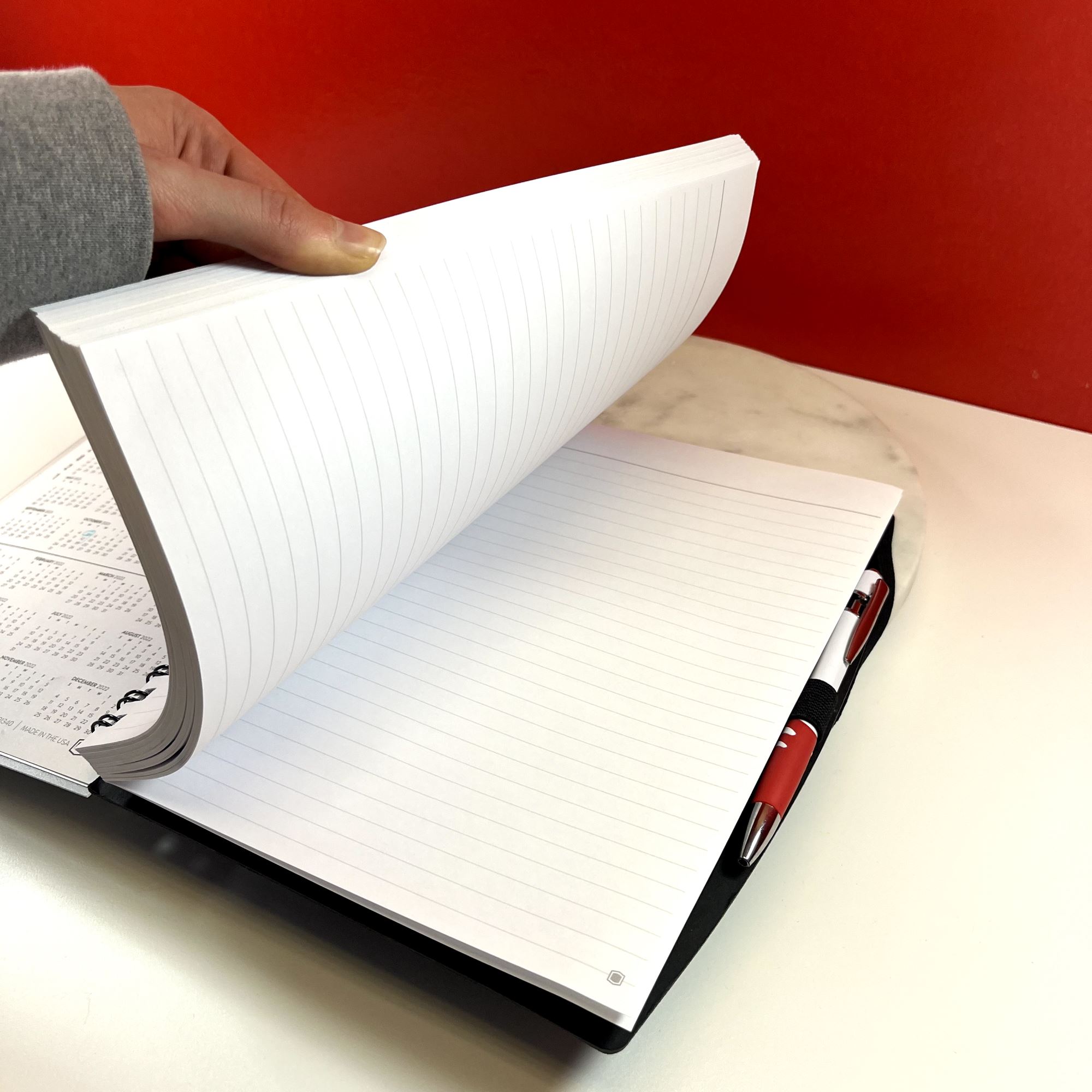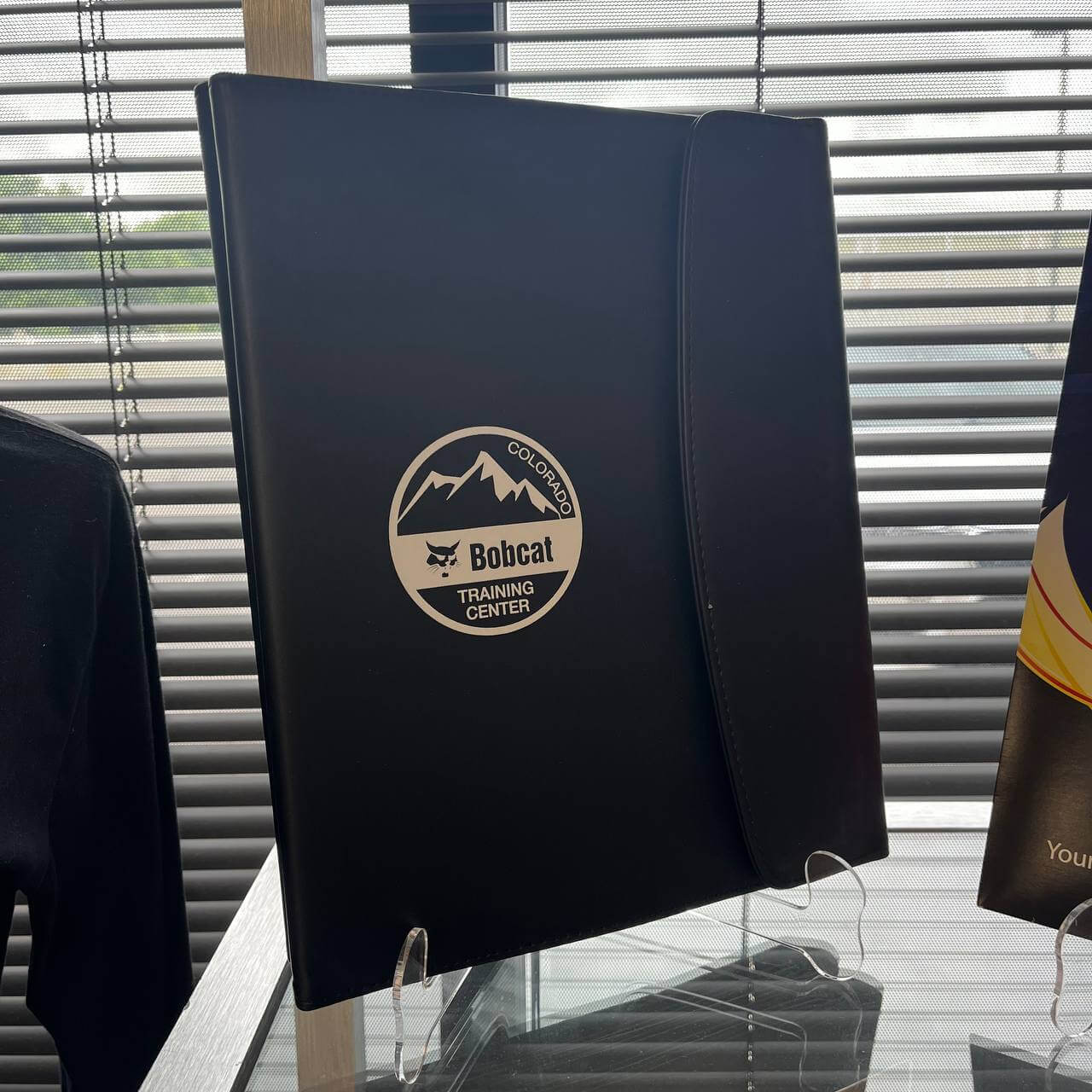 Professional black portfolio featuring a company logo on the cover, ideal for business meetings, presentations, or onboarding kits.