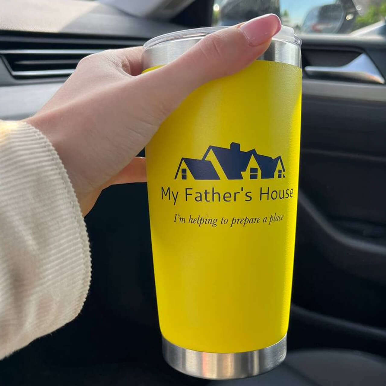 Bright yellow coffee tumbler with custom real estate branding, perfect for open houses, gifts, or office swag.
