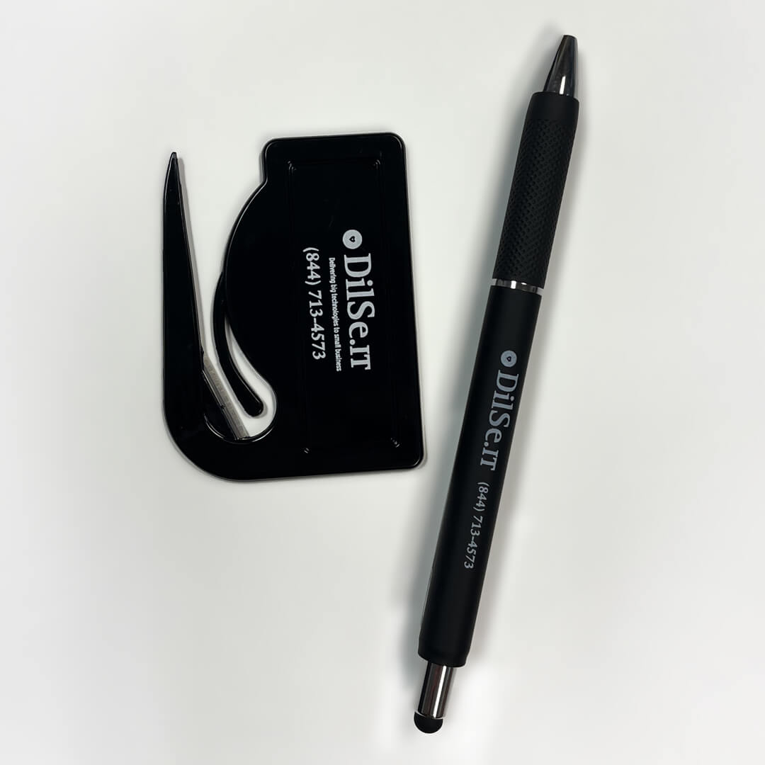 This dual-function pen and envelope opener features a sleek design with logo and contact information, ideal for business giveaways or office branding.