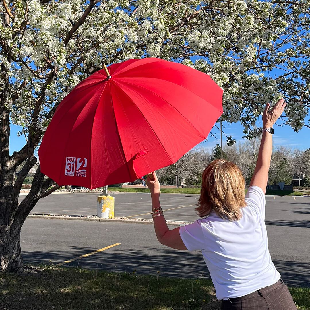 Photo of umbrella red with printed logo on it for kdvr denver created as part of our April 2025 custom branding and printing projects. Perfect for businesses and events in Aurora Colorado looking for local printing solutions. Find your printshop near me!