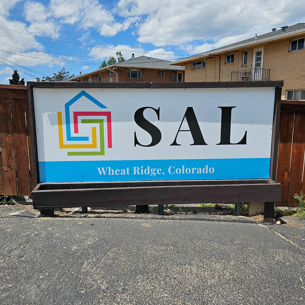 Custom large-format outdoor signage designed and installed by AlphaGraphics Aurora for an apartment complex entrance.