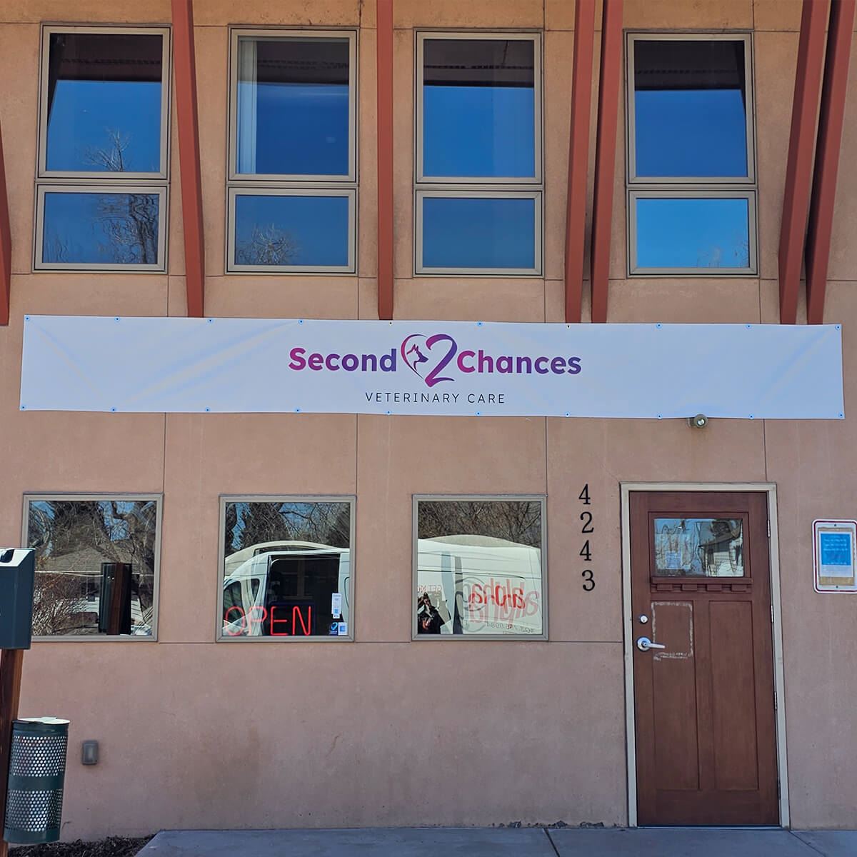Durable vinyl banner with grommets promoting veterinary care services, produced by AlphaGraphics Aurora.