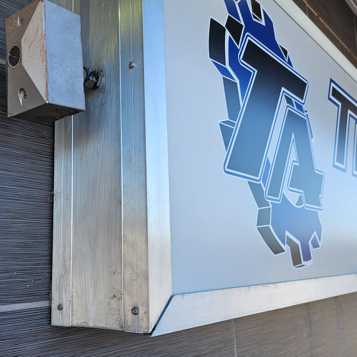 Close-up of the metal framework used for mounting custom building signage by AlphaGraphics Aurora.